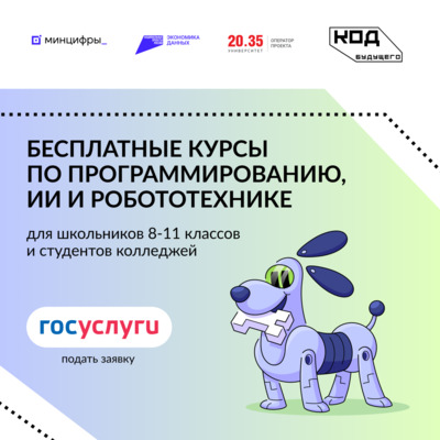 Программирование, робототехника и искусственный интеллект — попробовать себя в ИТ или углубить свои знания можно, ещё учась в школе. Подайте заявку на курсы для подростков «Код будущего» на Госуслугах и обучайтесь бесплатно. Те, кто успешно освоит программу, могут получить дополнительные баллы к ЕГЭ при поступлении в ряд вузов.